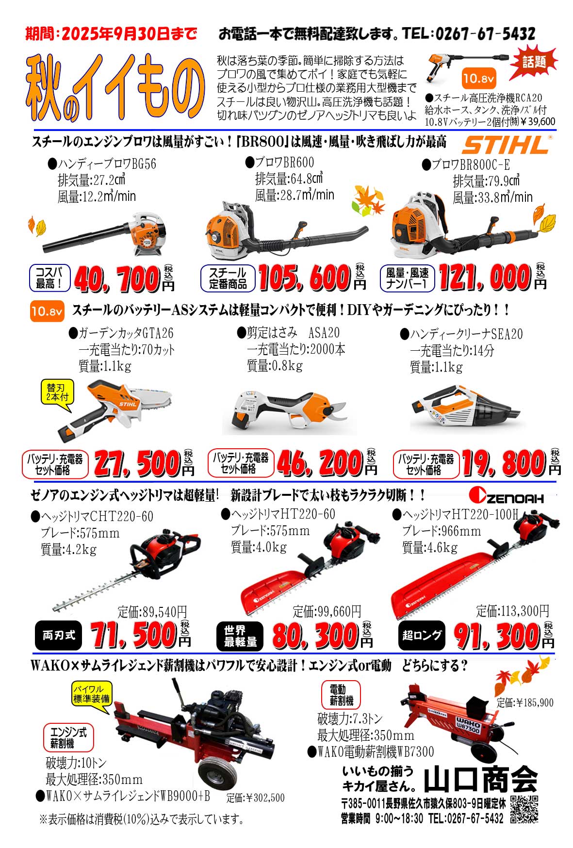 季節は秋!落葉掃除、剪定、薪割りなど様々な業務が山積み。良い道具でチャチャッとやっちゃおう!スチールブロワは小型のハンディから背負いの大型までラインナップが豊富。作業に合わせて選べる。10.8vのバッテリー道具も新製品が多く人気の「ガーデンカッタ」から新製品の「剪定ハサミ」「高圧洗浄機」も軽くてコンパクト。サカイ最軽量のエンジンヘッジトリマはゼノア製品。軽くてブレード改良で枝葉をすぱっと切れるので作業効率アップ!次の日の疲労感が減少するほどです。薪割機はエンジン式の小型と電動の中型が人気!分からない事は気軽にご相談下さい。