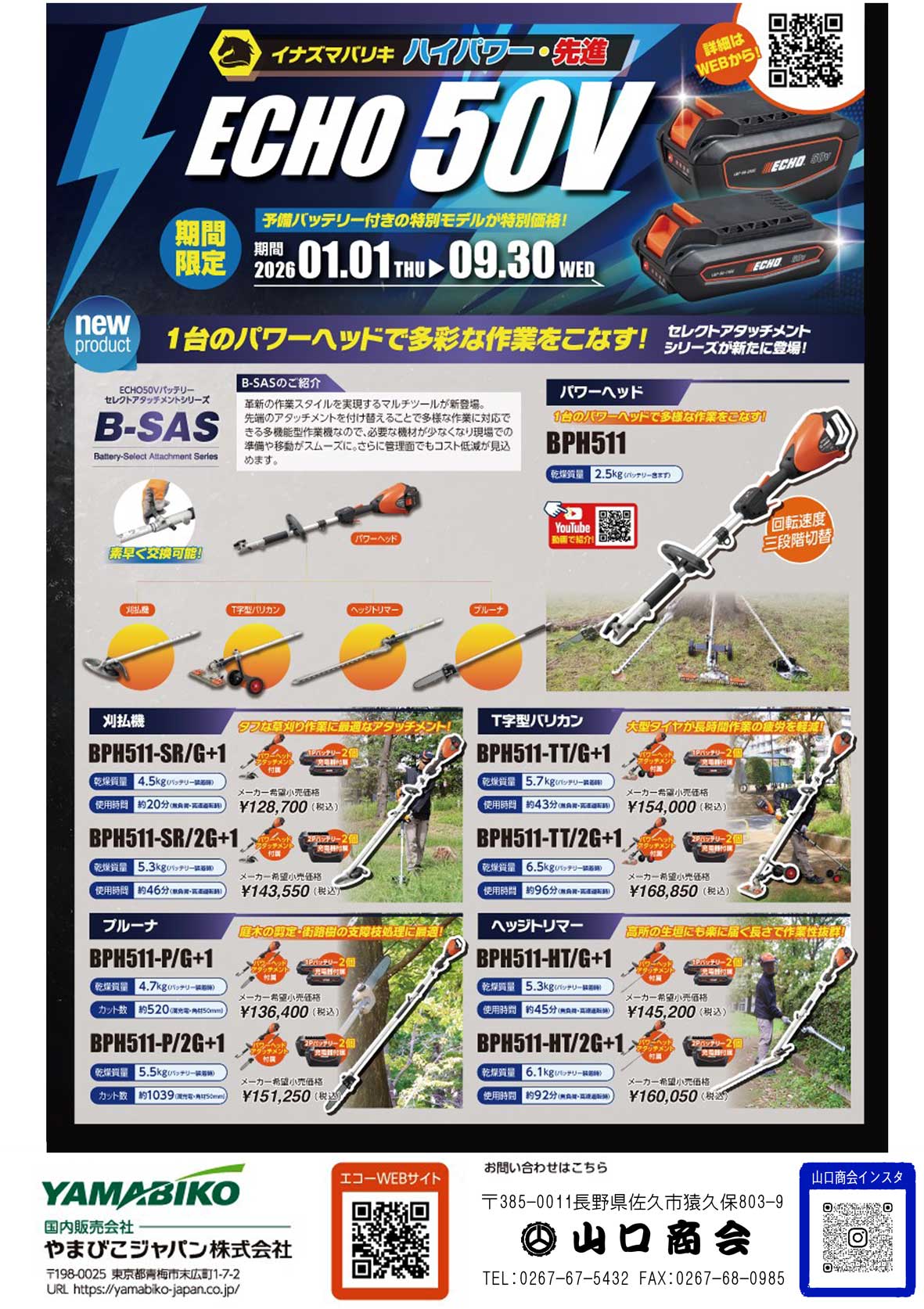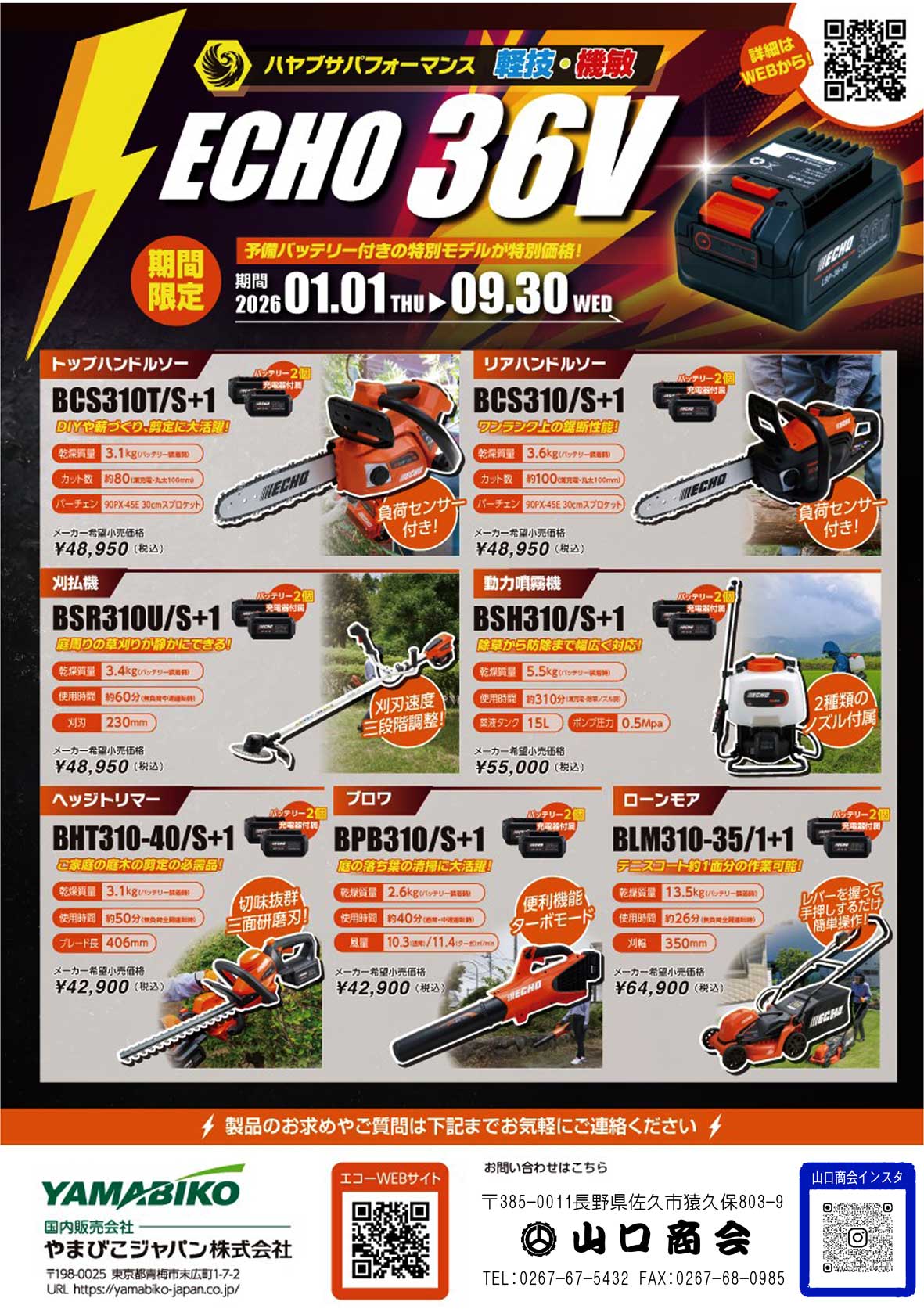 やまびこのバッテリーツール「エコーECHO」シリーズで予備バッテリー付のお得なキャンペーンを開催します。エンジン並みの「50Vイナズマバリキ」と気軽に使えるホームモデル「36Vハヤブサ」は様々な場面で使えるバッテリー道具。チェンソー、刈払機はもちろんブロワ・芝刈機・背負い動噴など続々登場。50Vシリーズの新製品「B-SASセレクトアタッチメント」は先端を交換する事で「草刈り」「バリカン」「ヘッジトリマ」「プルーナ」作業ができる!それぞれの作業を一つの動力で行うので便利で経済的。便利なバッテリー道具は作業時間に制限が有り「予備バッテリー」は必要。そこで予備バッテリーのついた「プラスワンキャンペーン」を期間限定で開催中!!初めての方におすすめ!エコーのプラスワンキャンペーン。※ご相談はお気軽に連絡下さい。